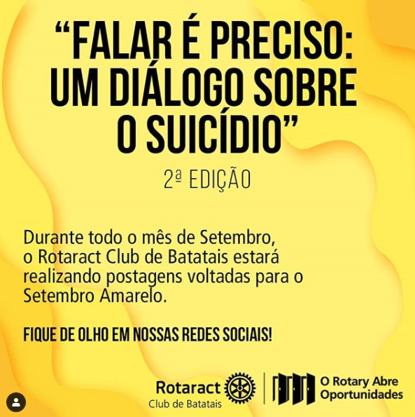 Refletindo sobre o tema, o Rotaract Club de Batatais continuou com o projeto prosa do bem sendo realizado em formato de lives e como efeito lançada a 2ª edição do projeto Falar é preciso um diálogo sobre suicídio; convidando profissionais ligados à área da saúde mental para uma conversa sobre suicídio. O clube contou com a ajuda de duas associadas atuantes na área da saúde mental; Marília Gachet (Psicóloga Clínica) e Letícia Mantovani Maggi (Psicóloga Clínica).